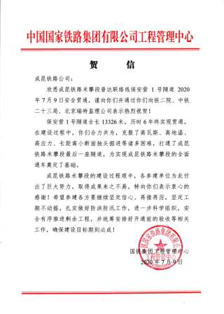 國(guó)鐵集團(tuán)工程管理中心專門發(fā)來賀信,祝賀我公司負(fù)責(zé)監(jiān)理的成昆鐵路保安營(yíng)1號(hào)隧道(米攀段普達(dá)聯(lián)絡(luò)線)于2020年7月9日安全貫通,謹(jǐn)向建設(shè)單位成都局成昆鐵路公司并轉(zhuǎn)向參建北京瑞特監(jiān)理公司和設(shè)計(jì)施工單位表示熱烈祝賀!
