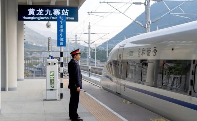 2024年8月30日,G5818/5815次列車沿川青鐵路由黃龍九寨站駛往成都東站。川青鐵路是我國“八縱八橫”高鐵網(wǎng)中蘭州、西寧至廣州通道的重要組成部分,更是填補(bǔ)西部鐵路“留白”的關(guān)鍵一筆。